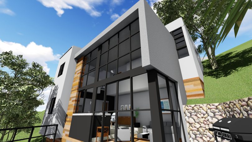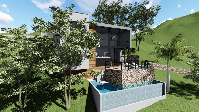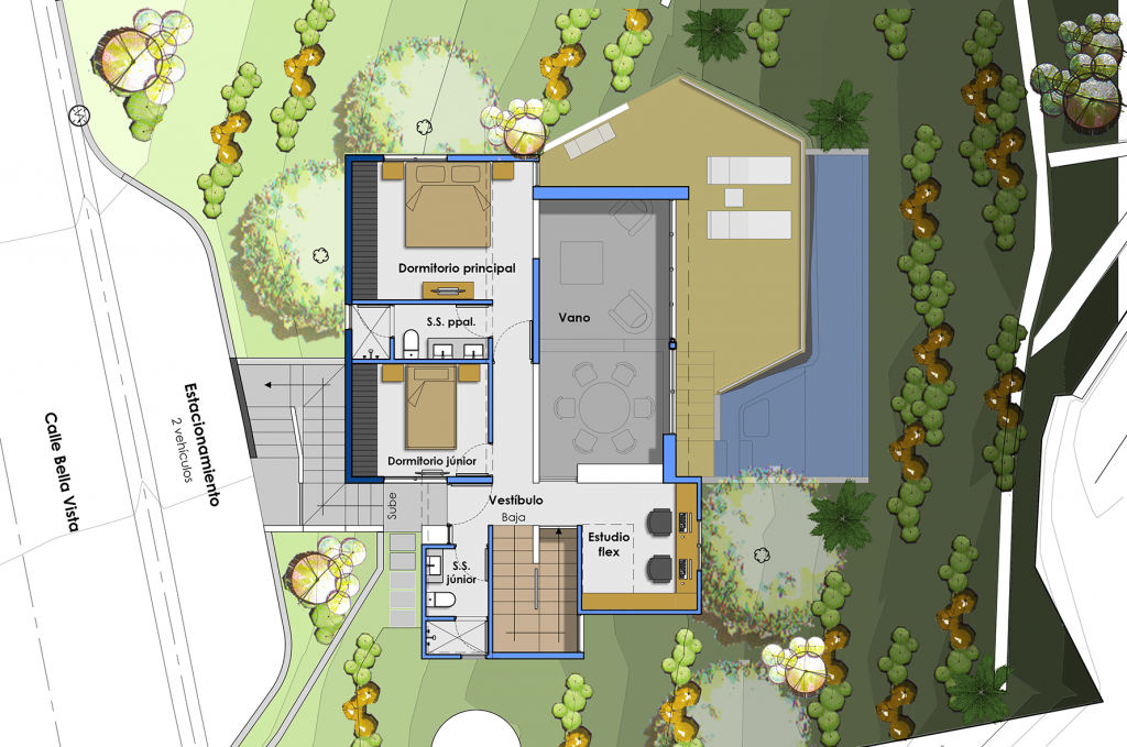 La Casa Los Riscos 13 se emplaza sobre la ladera del terreno en 4 niveles, ocupando un área de 130 m², se dispone a nivel de calle de un estacionamiento paralelo para 2 vehículos y el acceso que por medio de escaleras conduce a la planta alta, en donde se ingresa a un vestíbulo en mezanine que dispone, dormitorio y baño principal, dormitorio y baño secundario y un pequeño puente para llegar al estudio. Desde el mezanine se aprecia una doble altura en la que se conecta con el área social a la que se accede por medio de la escalera principal que conduce a la planta baja, en donde se dispone de cocina, baño social, cuarto de oficios, comedor y sala. Esta última guarda una especial relación con el exterior al conectarse con una terraza de amplia visibilidad a la ladera y el mar; haciendo que este entorno sea la esencia del diseño completo de la casa. Finalmente en un cuarto nivel más bajo se ubica la piscina infinita que abraza el muro de la terraza como si se tratara de un amor fraternal.