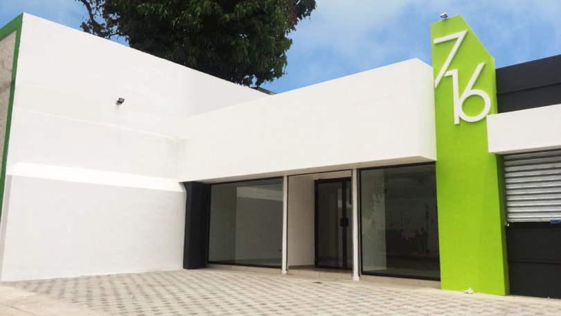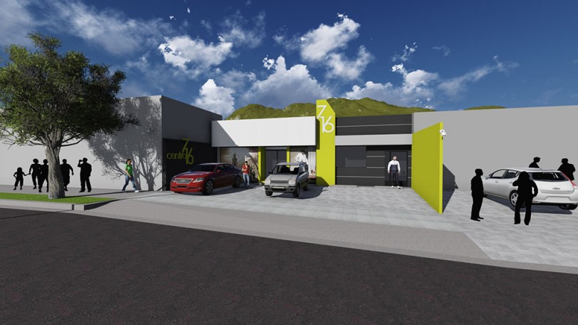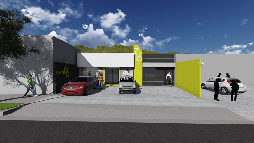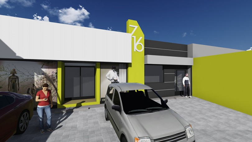 En cuanto a forma, el proyecto recurre al fachadismo para cambiar el carácter de la edificación existente de manera que su lectura se aleje del uso habitacional acercándose al de un negocio comercial. Para ello se hace uso de parapetos y fascias que depuran el volumen alineándose a las tendencias contemporáneas de la arquitectura. En vista de que la intención es procurar un local comercial a nivel de calle y otros usos futuros interiores, la fachada se divide en dos partes, una que mantiene la transparencia necesaria para escaparates y comercialización visual y otra más cerrada, con cierto tratamiento de superficie en donde se ubica el acceso a los usos futuros. Un volumen central de proporción vertical sirve para romper la simplicidad de las fachadas creando contraste en forma y color, aprovechando su protagonismo para la colocación del nombre del centro «716» de manera que el sitio adquiere identidad en su propio contexto.