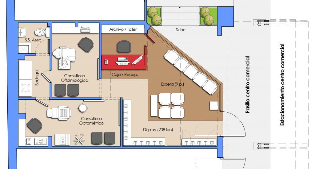 El proyecto se resolvió mediante una circulación lineal que dirige al cliente desde el acceso hacia las áreas de display, espera y caja / recepción. Del mismo modo, en la parte posterior se dispone la zona corporativa de consultorios, cuyo acceso es controlado en la caja / recepción, dirigiendo hacia los consultorios optométrico y oftalmológico. En la parte posterior se ubican la bodega y el servicio sanitario, espacios a los cuales se accede mediante puertas controladas en cada consultorio.