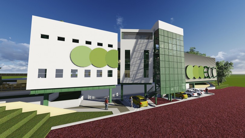 El proyecto Edificio de Laboratorios ECC se ubica dentro del campus 1 de la Universidad Dr. José Matías Delgado (UJMD), localizado sobre el Km. 8.5 de la carretera a Santa Tecla, municipio de Antiguo Cuscatlán, departamento de La Libertad. Está proyectado al costado norte del actual edificio no. 6 que alberga a la Escuela de Ciencias de la Comunicación (ECC) y aulas para las escuelas de Medicina e Ingeniería Industrial[1], la porción de terreno a intervenir es de 1,532.70 m2 de los cuales un 80% es utilizado para la construcción, el resto contempla áreas verdes y de urbanización para integrar el edificio al resto del campus.
