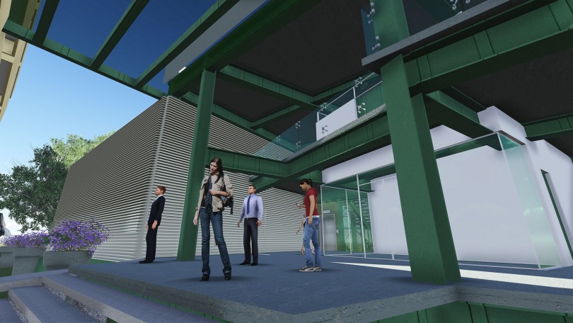 El proyecto está concebido para mejorar la calidad educativa de los estudiantes, por lo que se emplaza al costado norte del edificio no. 6 separándose cinco metros de este para evitar interferencia de actividades. En la actualidad, la enseñanza complementaria propia de las ciencias de la comunicación se lleva a cabo en estudios provisionales ubicados en los pasillos del segundo y tercer nivel de este edificio, por lo que la intención principal es reubicarlos en el nuevo edificio para liberar los espacios originalmente destinados a la circulación pública. Es así como el proyecto se compone de tres subzonas: Fotografía, Radio y Televisión, articulando su conexión a través de dos plazas centrales a diferentes niveles, un núcleo de circulación vertical y un pasillo hacia el edificio 6, la separación entre las subzonas permite aberturas suficientes para mantener flujos de aire del norte, lo que permitirá la ventilación de la que goza actualmente el edificio no. 6. Los cuerpos se disponen paralelos a dicho edificio, exceptuando el que alberga la subzona de Radio que se emplaza con un eje rotado 20 grados, rompiéndose la “ortogonalidad”.