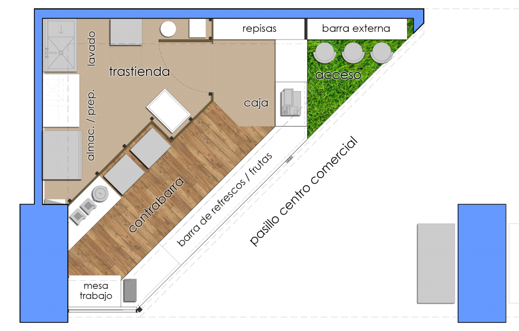 La zona comercial se resuelve de manera externa incorporando la barra de refrescos y frutas al pasillo del centro comercial, así como la mesa de trabajo visible desde dicho pasillo y, a la vez, se dispone de una barra para clientes. El resto del establecimiento se conforma con la zona de servicio, que se resuelve mediante dos circulaciones, una a lo largo de la contrabarra y cámaras refrigerantes y otra hacia la trastienda.