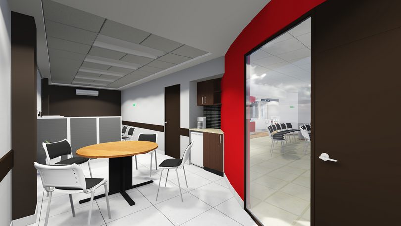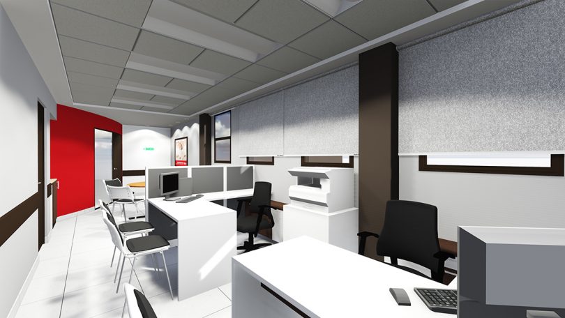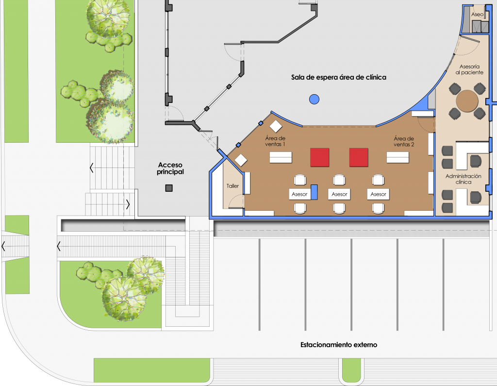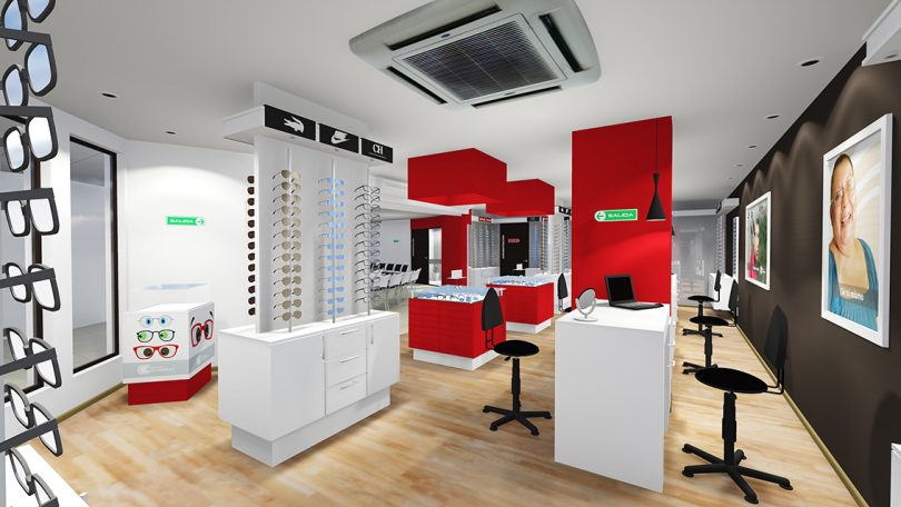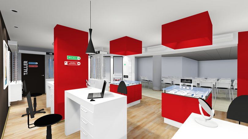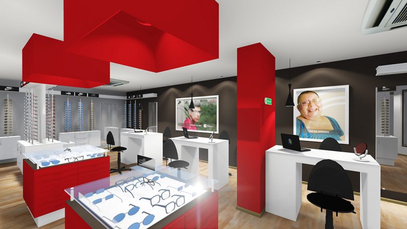 El proyecto se resolvió con tres accesos independientes desde la sala de espera de la Clínica. La solución de la zona comercial se hace mediante dos circulaciones lineales, una frontal y una posterior, el acceso se hace por medio de los displays centrales de manera que en ellos se coloque el producto de mayor atracción. En la parte posterior se colocan los asesores y el ajuste y entrega final; en la zona comercial se encuentra además a un costado el taller de la óptica con espacios de almacenaje y en el otro costado se dispone una puerta de acceso controlado a la zona corporativa empresarial. Por otro lado se accede a la zona corporativa empresarial, donde se sitúan la sala de reuniones, el café y los administradores; y finalmente en otro punto se