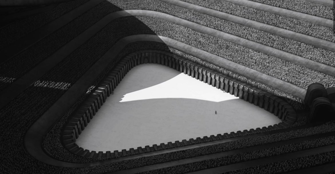 Uno de los escenarios más memorables, el campo de batalla, hace alusión a las estructuras de la antigua Roma. Las superficies acanaladas revestidas en plástico negro representan el vientre de una ballena, un espacio grandioso pero ineludible.