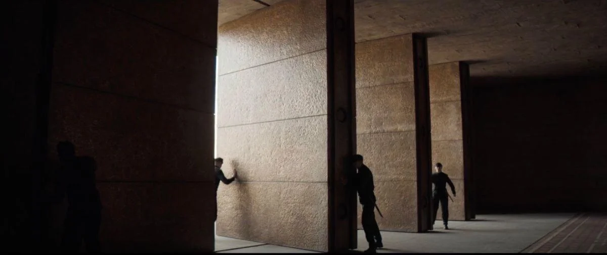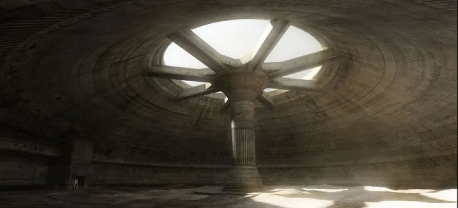 El palacio de Arrakis (Dune), está a oscuras debido al calor extremo. La sala con bloques recortados al estilo de Frank Lloyd Wright.