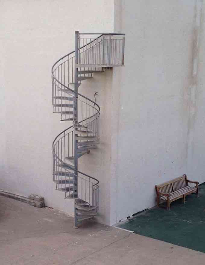 Escalera que que llevan a ningún lado. ¿Cuál habrá sido el objetivo de hacer esto? Escaleras de emergencia quizá, pero como que olvidaron la salida. En el futuro bien podrían colocar un tobogán y asunto resuelto.