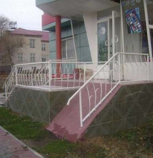 ¿Rampa de acceso para discapacitados? Según las normativas deben tener un máximo de 10% de inclinación. Aquí parece andar por el 80, por lo que podemos asegurar, que no es muy accesible para nadie.