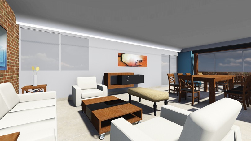 El espacio habitacional de este apartamento se resuelve por medio de la Zona Social en donde se ubica un pasillo central que comunica todos los espacios interiores. La Zona Social se define por los espacios de sala principal, secundaria, comedor y terraza, siendo el pasillo de acceso la circulación lineal a partir de la cual se relacionan los espacios semipúblicos y privados.