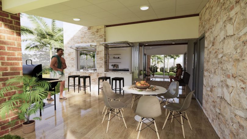 La renovación de esta casa comprende, una nueva habitación con baño propio, una cocina más amplia y a la que se le incorporó una barra para desayunar, con acceso desde la terraza principal, donde además se ubica la mesa de comedor, y por la parte trasera se adicionó una pequeña terraza. Así mismo se mejoró el área social, a la que se le dio mayor confort, ya que antes era abierta y ahora cuenta con aire acondicionado para las actividades familiares, como ver televisión. Todo esto se sumó a las 3 habitaciones existentes, junto al baño compartido, al que se le hicieron algunas mejoras, para brindar más comodidad.
