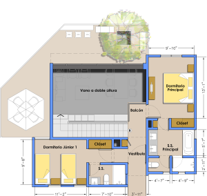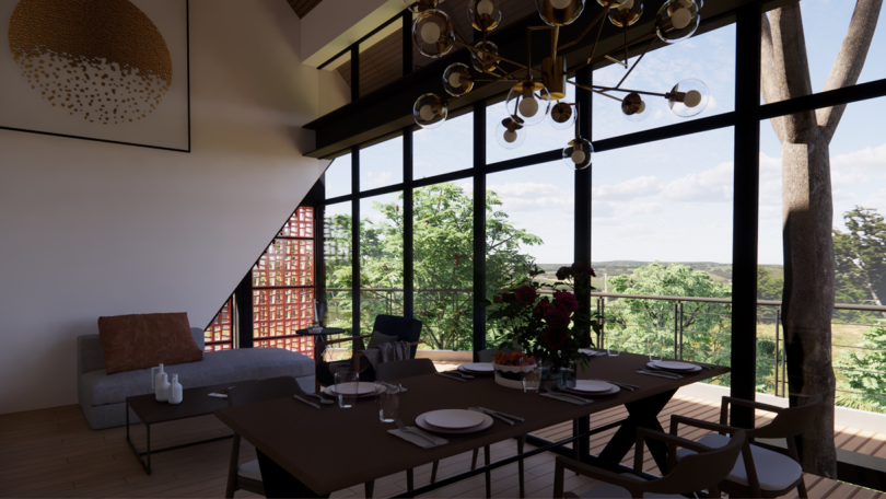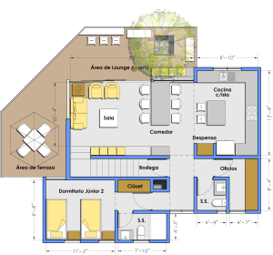 Los desniveles del terreno se comunican por medio de un caminamiento que mejora la accesibilidad entre la zona de estacionamiento. La zona habitacional y el resto del terreno se conservan en condiciones naturales. Para dar sentido a este caminamiento se propone la construcción futura de un deck hamaquero en la parte inferior.