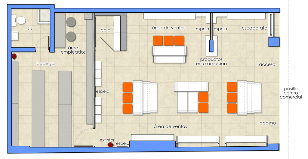 De acuerdo al concepto planteado, se decidió que el espacio de Jamcalza en Metrocentro San Salvador posea un carácter minimalista, catalogado así por ser un estilo que utiliza elementos esenciales, colores puros (con el predominio del blanco), un lenguaje sencillo y que busca generar sentido sin exceso de elementos decorativos.  Este estilo surgió cerca de los años sesenta en el arte y luego se extendió a la arquitectura con el movimiento De Stijl (Perez & Gardey, 2011). La identidad de la marca se refuerza con acentos en color naranja corporativo y ciertos elementos gráficos identificativos.