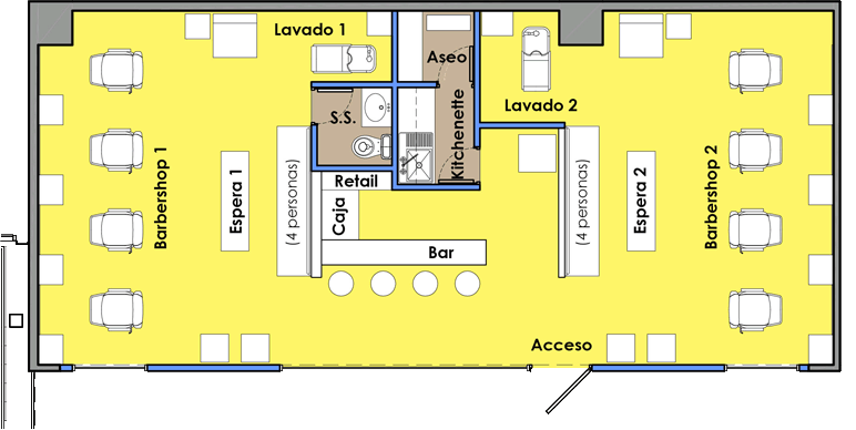 The Moustache, Metrocentro San Salvador, se resuelve por medio de la centralización de la Zona Privada. La Zona Pública se define a partir de los ambientes de las estaciones de barbero y las áreas de espera de los clientes, el espacio es regido por una distribución en “U” que desde el acceso lleva al usuario hacia los espacios que alojan las estaciones de barbero y la espera, separando dos ambientes relativamente similares. Al centro la caja bar separa el área de atención de la Zona Privada en donde se alojan Kitchenette y Cuarto de Aseo.